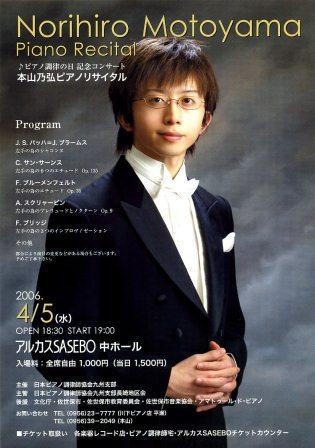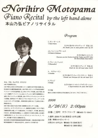 JAPON) Ravel : Concerto pour la main gauche Saint-Saëns : 6 Etudes pour la main gauche seule op.135 J.S.Bach / Brahms : Chaconne en ré mineur pour la main gauche seule Scriabin : Prélude et Nocturne pour la main gauche seule op.9 Blumenfeld : Etude pour la main gauche seule en la bémol majeur op.36 |