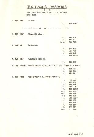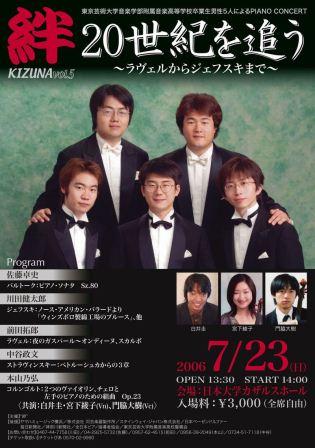 - Tokyo Geijutsu Daigaku (Tokyo, JAPON) Yamanaka : Trois mouvements pour Violon, Violoncelle et Piano pour la main gauche seule (La première audition) [Fuyu IWAKI, violon] [Yuuichi NATSUAKI, violoncelle] [Norihiro MOTOYAMA, piano] etc. |