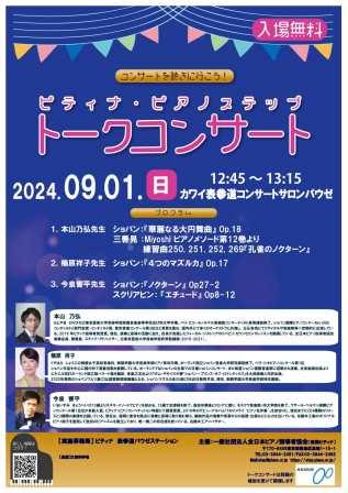 ご希望の際は、こちらのお問い合わせフォームより、 ・お名前とご連絡先など必要事項 ご記入の上お申し込みください。 ※佐世保公演は、前後位置、左右位置ともまんべんなくお預かりしておりますので、 ※長崎公演:やや後方よりのお席 大村公演:前後位置中央付近のお席 をそれぞれお預かりしておりますので、大まかなご希望の左右位置を、やはり第3希望までお知らせください。 ☆テレビマンユニオン チャンネルにて、16日佐世保公演の有料ライヴ・アーカイヴ配信もございます。(チラシには18日大村公演とございましたが、諸事情により配信日が変更になりました。) (2024.4.30) (2024.2.17) (2023.7.29) ピティナ・ピアノステップ 大泉学園地区 地区コード2639 ピアノに取り組まれる様々な年齢とバックグラウンドをお持ちの皆様が演奏され、 (2023.6.29)