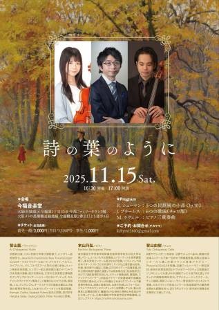 ふくしん夢の音楽堂大ホール (福島市音楽堂) (福島県, 福島市) 未就学児童音楽教育体験事業応援 プーランク:ヴァイオリン・ソナタ (2025.5.11) (長崎県, 西彼杵郡長与町 JR長与駅より徒歩10分) ピティナ・ピアノステップ 長崎2月地区 トークコンサート曲目 秦野市楽友協会主催 新春音楽講習会 ドビュッシー:映像第1集より「水の反映」 入場料:3,000円 ※チケットのご予約は、チラシ記載のQRコードからお申込みいただけるほか、当サイトでも承っております。 マスターズ・コンサート 本山乃弘ピアノリサイタル ※当公演は、親族の体調不良によるやむを得ない事由により、延期させていただくこととなりました。楽しみにご予定いただいた皆様へご迷惑をおかけし大変申し訳ございません。延期日程につきましてはまた後日改めて、決まり次第ご案内いたします。 シューマン:アラベスク Op.18 入場料:3,000円 ※座席の少ない会場の為、ご予約は直接チラシ記載の連絡先までお願いいたします。 (2024.12.12) 東京藝術大学音楽学部附属音楽高等学校創立70周年記念